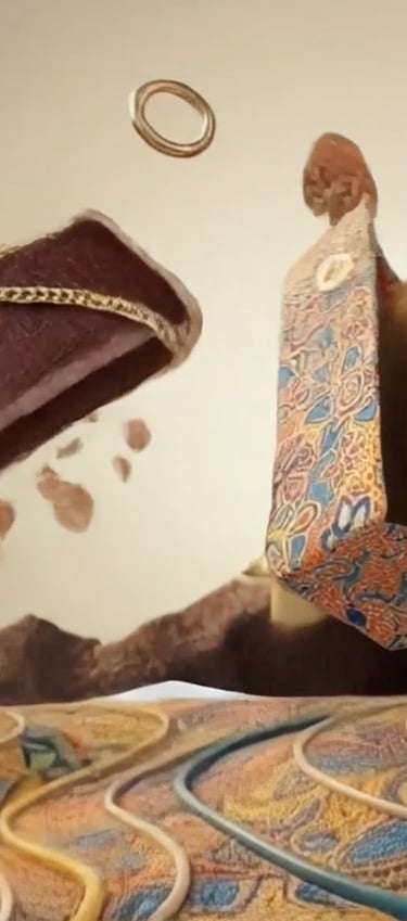 Soudain, les éléments du décor se détachent les uns des autres, certains se désagrègent. d'autres se découpent et changent de forme pour former un élément du sac à main. Chaque pièce et texture virevolte et se met en place dans l'espace. le mouvement est fluide. l'image prend forme et nous découvrons chaque pièce du sac flottant dans l'espace (fond vert). Chaque élément du sac flotte dans l'espace, prêt à être assemblé.